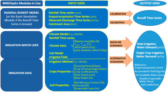Recent approaches such as the development of a DSS are scaled to irrigated agriculture with different conditions. Improving the allocation, planning, and management of water resources and irrigation schemes are the main concerns of DSS models applied at farm level. Irrigation DSS is used to address decision-making problems regarding how to equally and promptly support optimal water allocation in accordance to the irrigation schemes [28]. The MIKEHydro Basin is a map-based decision support tool, a comprehensive deterministic, and multipurpose model used for a large variety of applications. It includes modular structures with model features required for efficient and accurate water resources modelling (Figure 4). It is the ideal tool to solve water allocation and water shortage problems, to evaluate and assess water supply and crop water requirements. Simulations scale of application may range from large river basins to smaller local projects [29].