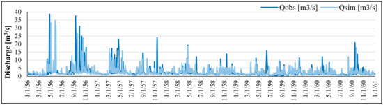 The preliminary analysis of the discharge data proved low peaks within the period from 1961 to 1968, which are significantly far from the local climate conditions. In order to obtain a good fit during the validation period, several attempts of re-calibrating the model have been made. The model was, however, run on a daily time step using the parameter values for the calibration period. Moreover, the water balance for the validation period proved that the amount of water in the river was higher than the observed, as previously shown in the graph in Figure 8.