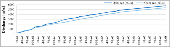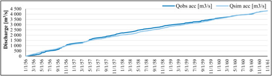 Consequently, the observed (Qobs, acc) and the simulated accumulated discharge daily values (Qsim, acc), over the calibration time-period showed a good estimation of the water balance (Figure 7).
