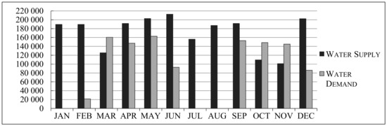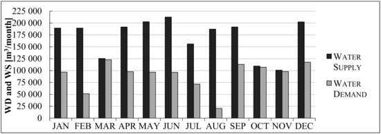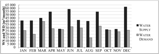 The extended record provided an evidence of decent discharge values and verified by the discharge measurement explained previously. A comparison between the amount of water demand and water supply was performed, in order to suitably evaluate and monitor water excesses and deficits [38]. Monthly discharge values are expressed in millions cubic meters per month, [MCM/month]. The amount of water supply on a yearly basis is 4.26 MCM/year (Table 2).