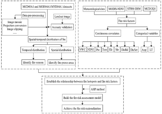 The flowchart of generation of fire risk maps is shown as follows (Figure 2), including three sections: (1) Identify the fire prone areas and fire season based on the analyses of spatial–temporal process of fire, (2) choose the fire risk factors, and (3) establish the relationship between fire hotspots and fire risk factors, build the fire risk assessment model, and achieve the fire risk regionalization.