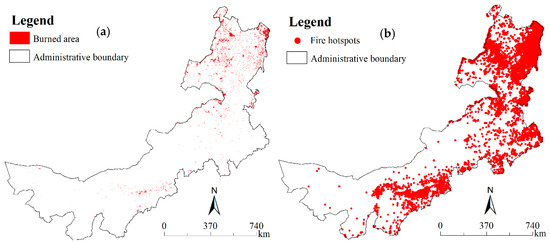 Spatial distribution of (a) burned areas and (b) fire hotspots in Inner Mongolia during 2002 and 2016 derived from MODIS sensor.