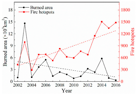 The annual variation of burned areas and fire hotspots in Inner Mongolia from 2002 to 2016.