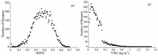 After extracting these variables described above (Table 3), we tried to examine the relationship between environment controls and fire. Considering that it is difficult to establish the relationship between burned area and environmental controls, only the correlation between driving factors in fire season and fire hotspots numbers is discussed in this paper. According to the status of the variables, the paper deals with them in separate discussion. For continuous covariates (e.g., temperature (Tem), precipitation anomaly (Pre), NDVI, vegetation water content (VWC), elevation (Ele), slope (Slo), distance to roads (DisRd), and distance to settlement areas (DisSet)), we extracted the values of each fire hotspot and unveiled the relationship between continuous variables and fire hotspots. For categorical variables (e.g., land use type (LT) and aspect (Asp)), we compared the observed fire frequencies (the proportion of fire hotspots in particular class to the total fire hotspots) and the expected fire frequencies (the proportion of the area in particular class to the whole area). Then, a chi-square test was conducted to reveal the association of categorical variables and fire hotspots ([12]). Finally, the variables included in the model were determined.