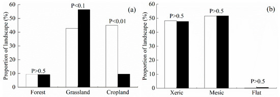Proportion of observed frequency (solid bars) and expected frequency (open bars) for the fire occurrence: (a) land use type and (b) aspect. The P-value was reported from chi-square test to examine differences in the number of fire hotspots among the different categories.