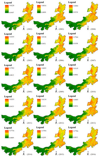 Yearly composites from 2002 to 2016 of fire risk maps in Inner Mongolia.