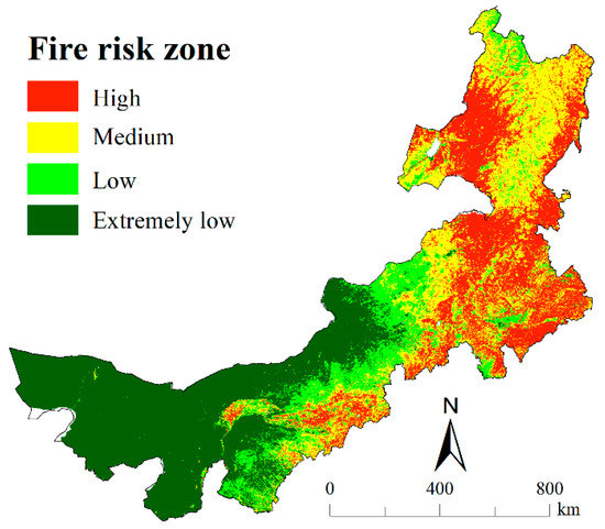 To be a better reference for the local fire department, the fire risk map was divided into four classes (extremely low risk, low risk, moderate risk, and high risk) based on the natural break method after taking the average value during the 15 years (Figure 9).