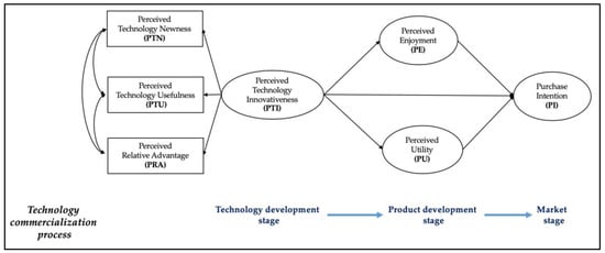This study considers both the emotional and rational values of the products to which the technology is applied as sub-factors in the product stage. In addition, it analyzes how the value of innovative technology is influenced by the value factor. Emotional value can be explained as the perceived enjoyment (PE), meaning fun, excitement, etc., that will be felt when using the product. In the adoption of information systems with excellent technological advances, the enjoyment of experiencing the newest technology is an important adoption factor, along with the functional benefits [56]. The rational value of a product is the perceived utility (PU), which refers to the benefits, advantages, and usefulness of a product. PU factors cannot explain the adoption of hedonic goods that do not offer PU [57]. However, tangible and highly functional products also provide PE [58].