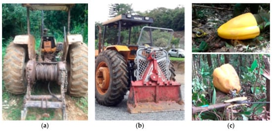 Harvesting equipment used: (a) Standard 2 × 2 farm tractor with a TMO Caçador® winch used in the conventional method (CM); (b) TAJFUN® winch fitted on a 4 × 4-farm tractor used in the alternative method (AM); (c) Skidding cone and snatch block supplementing the AM extraction.