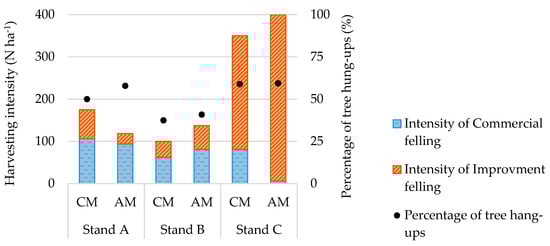 There was a high number of tree hang-ups during the felling process, for both harvesting methods in all three stands (Figure 3). In stand C, characterized by the improvement cut of a high number of small trees, the highest rate of tree hang-ups was observed (59% for both methods). Stand B with more favorable terrain conditions, bigger trees, and lower tree density, presented the smallest rates of tree hang-ups, with 38% for CM and 41% for AM.