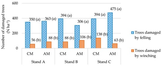 Harvesting damage caused by felling and winching for conventional (CM) and alternative (AM) harvesting method across stands, considering all trees with DBH ≥ 7 cm o.b. The values represent the mean values. Different letters indicate significant differences between felling and winching damage.