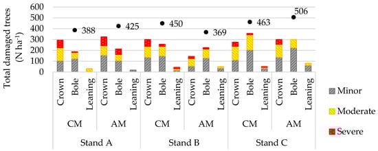 Noticeable is the lowest number of crown damages during AM operation in stand B (143.8 trees ha−1), which represented 11.4% of the total remnant trees and, hence, resulted in a lower number of total damaged trees per hectare (368.8 trees ha−1). Bole damages were also the most damaged tree section for AM in stand B and for CM in the flat terrain and dense stand C. Another important result was that for bole damages, minor intensities were prevalent across all the stands and harvesting methods. Additionally, the rate of tree leaning ranged from 2.2% (31 trees ha−1 in CM, stand A) to 5.5% (81 trees ha−1 in AM stand C) and represented the lowest observed damages on remnant trees.