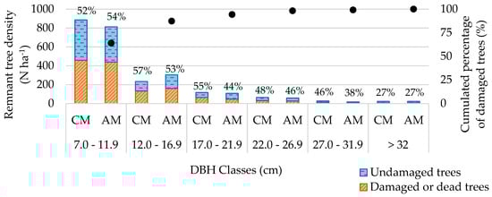 Harvesting damage for the conventional (CM) and the alternative (AM) harvesting methods, considering DBH classes for all tree species. Black dots represented the cumulated percentage of damaged trees related to the total number of remnant trees, for both harvesting methods. Numbers above bars represent the rates of damaged or dead trees related to the total number of remnant trees per DBH classes.