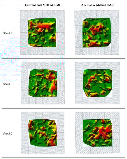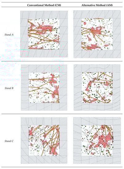 Most of the damaged trees were concentrated in small areas within the plots. Stand A showed a slightly larger “high damaged area” (13.8%) compared to stand B (11.1%) and yet this area was lower than for the dense stand C (15.9%). In stand A and B, the CM harvesting damaged a larger area with “high damage intensity” (234.3 m2 and 194.5 m2) compared to AM harvesting (206.0 m2 and 160.0 m2, respectively). Differently, in Stand C, CM presented a lower “high damaged area” (218.5 m2), compared to AM (290.8 m2) (Table 6).