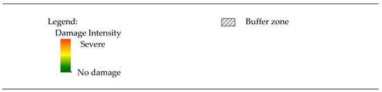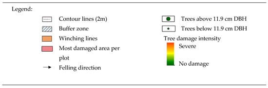 Damage maps per plot and harvesting method. The damage intensities ranged from undamaged trees (green damage zones on the map) to severely damaged and dead trees (red damage zones on the map).