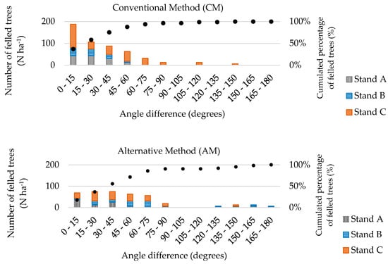 Finally, most of the harvested trees were felled following the predominant slope direction, which may also indicate the natural felling direction of each tree. However, the AM operator could fell a tree in a higher range of felling angle directions than the local CM, mainly due to the favorable conditions of stand B.