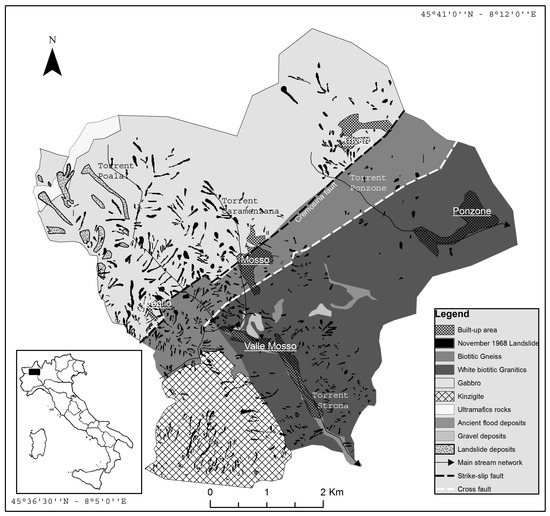 The study area, about 150 km2 wide, extends from the southern border of the Pennine Alps (NW Italy) to the hills (granitic massif of Biella). The study area is delimited by the drainage basins of the Strona and Sessera rivers, both located in the northern part of the Piemonte region (NW Italy). The Po Valley and the Pennine Alps, in the sub-sector of Biellesi and the Cusiane Alps [25], constitute a further geographical limitation of this area. Such an area exhibits a characteristic central relief, known as the Rubello–Prapiano–Massaro massif, which forms a natural barrier between the alpine and flatland zones. The massif, ranging from west to east between 1400 m and 1200–1300 m, respectively, stretches in parallel along two main fault lines, the Cremosina and the Insubric lines. The latter separates the Pennine Alps (NW) from the Meridional Alps (SE). Figure 1 shows a map of the main geographical and geological features of the study area.