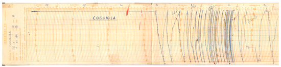 Original rainfall track recorded at Coggiola meteorological station. The maximum peak was recorded around 9 pm, with a rainfall amount 30 mm recorded in 30 min. The pluviogram has a rainfall amount resolution of 0.2 mm. The interval, from the bottom to the top of the pluviogram covers a span of 10 mm. The time resolution, reported on the horizontal axis, has a resolution of 1 h.