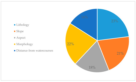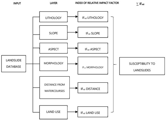 First, a set of instability predisposing factors was defined (e.g., lithology, land use, and slopes). This set was divided into classes. Then, a relative index was calculated through overlapping the landslides map with each single-factor map. The flowchart related to the calculation process is represented in Figure 4.