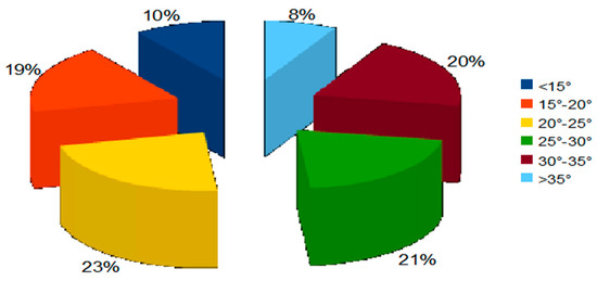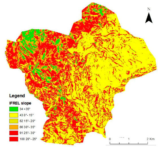 Based on the relationship between landslide and stable areas with respect to the fixed slope-dip classes, the relative ‘Landslide Indexes’ were computed. The inferred values showed that the majority of the landslide-prone areas (almost 50% of the identified processes) occurred in the dip interval between 20 and 30° (Figure 10).