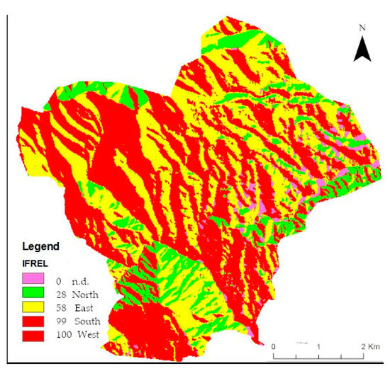 The slope’s aspect influences the micro-climatic conditions and vegetation cover along the slope. Moreover, the slope aspect affects the weathering of bedrock and controls the pedogenesis [41]. The aspect map was obtained by processing the DEM of the area and sub-dividing it into 4 spatial classes (North, South, East, and West).
