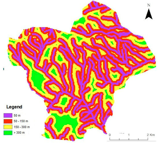 The map was sub-divided into 4 classes, grouping the areas as a function of distance from the impluvia and stream incisions. The fixed class thresholds were (1) 50 m, (2) 50–150 m, (3) 150–300 m, and (4) above 300 m.