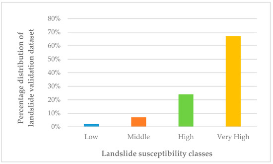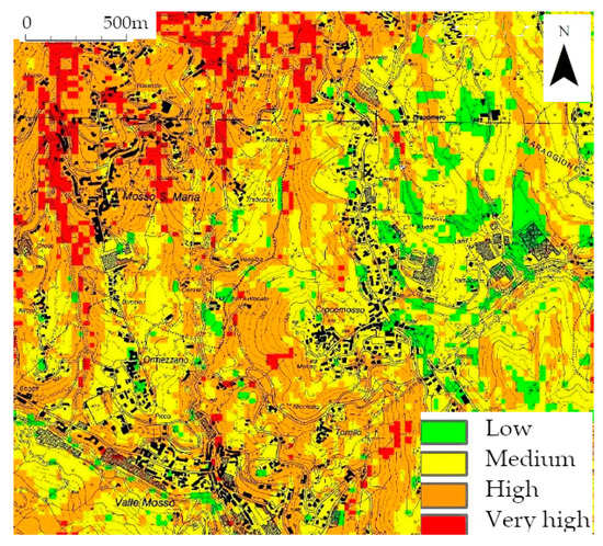 In particular, 67% of landslides belonging to the test dataset (used for the validation) fell into the ‘Very High’ susceptibility class, 24% fell into the ‘High’ susceptibility class, while only 9% belonged to the ‘Middle’ or ‘Low’ classes.