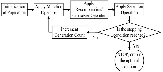 DEA is a stochastic, population-based evolutionary optimization technique that was introduced by Storn and Price in 1995. DEA is developed to optimize the real parameter and real valued functions. It can be used for solving various practical problems considering the non-linear, non-continuous, non-differential, and multi-dimensional features. The probabilistic distribution for the generation of offspring is not required for the DEA. This leads to less computational burden and less mathematical operations. An overview of DEA is depicted in Figure 2 [28].
