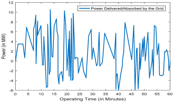 In this case, the railroad systems operation is performed without considering the RERs or energy storage systems, and the excess power does not feed back to the grid (this case is termed as the base case). However, the regenerative braking has been considered in this case. In this case, the objective function (i.e., Equation (11)) consists only of the first and last terms, as this case doesn’t consist of RERs and energy storage systems. As mentioned before, in this paper, DEA is used to solve the proposed optimization problem. The amount of power delivered or absorbed by the power grid is depicted in Figure 4. Table 2 presents the optimum objective function values for the case studies 1, 2, 3, and 4. Here, the obtained total generation is 4.748 MWh, the excess energy is 1.142 MWh, and the corresponding total cost of operation is $325.94 per hour. The computational time required for this case is 18.26 s.