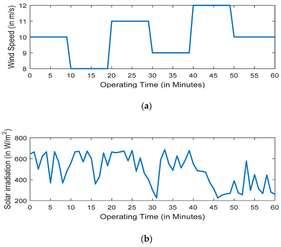 In this case, the railroad system operation is performed by considering the RERs, i.e., wind and solar PV energy systems (i.e., base case operation by including the RERs). In this work, the maximum capacity of wind power generating system () is considered to be 3 MW, is 3 m/s, is 12 m/s, and is 20 m/s. It is assumed that during the operating period (17:00–18:00), the forecasted wind speed is depicted in Figure 5a, and the available wind power output is calculated by using Equation (1).