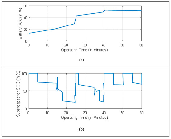 In this case, the objective function (i.e., Equation (11)) consists of all the terms except for the second and third terms, as this case doesn’t consist of the wind and solar PV energy systems. The state of charge of the battery and supercapacitor is depicted in Figure 6.