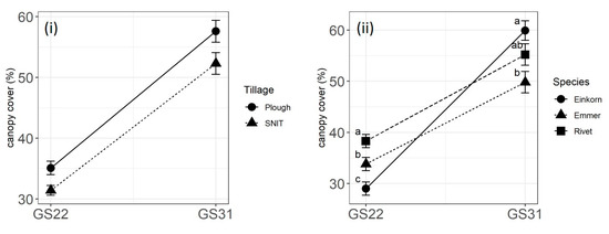 Crop canopy cover at BBCH GS22 and at BBCH GS31 as affected (i) by tillage and (ii) by species. Points are estimated marginal means ± standard errors. Within each growth stage, values with the same letter are not significantly different.