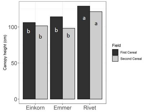 Overall, rivet was the tallest crop, followed by emmer, and in turn followed by einkorn. However, a significant species-by-field interaction was found. In the first cereal position, rivet was tall on average (129 ± 2.7 cm), with emmer and einkorn 14.8 cm and 22.9 cm shorter. In the second cereal position, rivet was 121.2 ± 2.3 cm, 19.6 cm, and 23.0 cm taller than einkorn and emmer, respectively (Figure 2). Significant species-by-field interaction did not reveal different patterns in the two rotational positions. However, in the second cereal field, the effect of tillage was also significant (X2 = 4.113 (1 df), p = 0.0426), with the crops grown on the ploughed areas 9 cm taller than those grown on the SNIT plots, which reinforces the idea that low fertility rotational position and SNIT might be a suitable option to grow tall species.