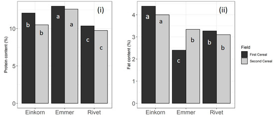 Field-by-species interaction had a strong effect on protein content. In the first cereal position, species effect was highly significant (X2 = 34.819 on 2 df, p = 2.75 × 10−8) with the highest protein content in emmer (12.9 ± 0.20%), followed by einkorn (12.0 ± 0.19%) and rivet (10.4 ± 0.20%). Despite the significant interaction, in the second cereal position, the effect of species was also significant (X2 = 40.864 on 2 df, p = 1.34 × 10−9), with top values in emmer (12.6 ± 0.15%), intermediate values in einkorn (10.5 ± 0.13), and the lowest values in rivet (9.75 ± 0.15%) (Figure 3 (i)). Total dietary fiber appeared to be only affected by rotational position, averaging 19.5 ± 0.28% in the first cereal position and 18.7 ± 0.28% in the second one. No effects of tillage, species, or interaction was observed. Conversely, fat content was significantly affected by species and by field-by-species interaction. In the first cereal position, top values were observed in einkorn (4.39 ± 0.14%), intermediate values were observed in rivet (3.27 ± 0.16%), and the lowest values were observed in emmer (2.40 ± 0.16%) (Figure 3 (ii)). In the second cereal position, a similar trend was also observed. In fact, the highest fat content was detected for einkorn (4.00 ± 0.10%), followed by emmer and rivet (0.66% and 0.90% respectively lower than einkorn) (Figure 3 (ii)). Even though the proportions of einkorn, emmer, and rivet wheat germs are similar, the fat content is different between species and appreciably higher than those reported in the literature for common wheat, especially in einkorn, confirming and being in accordance with previous scientific evidences [37,38].