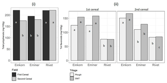 (i) Total polyphenol content (mg 100 g−1) as affected by species and rotational position, and (ii) total flavonoid content (mg 100 g−1) as affected by species, tillage and rotational position. Bars are estimated marginal means. Within each ‘field’ in (i) and ‘tillage’ in (ii), bars with the same letter are not significantly different.