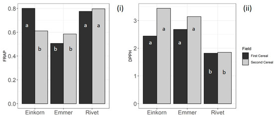 Unlike FRAP, DPPH was significantly affected by rotational position with higher values in the second cereal position (2.87 ± 0.12 μmol TE g−1) than in the first one (2.32 ± 0.12 μmol TE g−1). Species-by-field interaction was also significant. In the first cereal position, species was the only significant effect (X2 = 21.317 (2 df), p = 2.349 × 10−5), with einkorn and rivet showing similar values (2.44 ± 0.11 μmol TE g−1 and 2.68 ± 0.13 μmol TE g−1, respectively). With 1.82 ± 0.13 μmol TE g−1, the DPPH activity in emmer was significantly lower than that in either einkorn (p = 0.0019) and rivet (p = 0.0001). In the second cereal position, again, species was the only significant effect (X2 = 37.454 (2 df), p = 7.36 × 10−9). In addition, in this case, the results followed the trend seen in the first cereal field, with einkorn (3.44 ± 0.14 μmol TE g−1) and rivet (3.14 ± 0.17 μmol TE g−1) showing the highest activity, and emmer showing the lowest values (1.85 ± 0.17 μmol TE g−1) (Figure 5 (ii)).