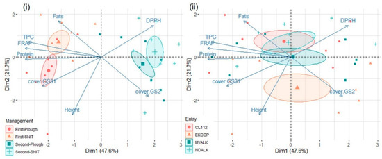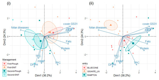 Rivet wheat: principal component analysis of the variables with quality of representation (Cos2) ≥0.4, with observations grouped by management (i) and by entry (ii). Confidence ellipses around group mean points are shown. Management: First-Plough = first cereal position, ploughed; First-SNIT = First cereal position, shallow non-inversion tillage; Second-Plough = second cereal position, ploughed; Second-SNIT = second cereal position, shallow non-inversion tillage. Entries: BLUECONE = Percival’s Blue Cone; GIGANTE_LN = Gigante Lampiño de Najera; RAMPTON = Rampton’s Rivet.