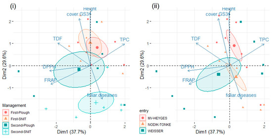 Emmer: principal component analysis of the variables with quality of representation (Cos2) ≥0.4, with observations grouped by management (i) and by entry (ii). Confidence ellipses around group mean points are shown. Management: First-Plough = first cereal position, ploughed; First-SNIT = First cereal position, shallow non-inversion tillage; Second-Plough = second cereal position, ploughed; Second-SNIT = second cereal position, shallow non-inversion tillage.