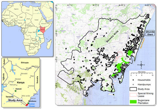 This work represents part of a wider study to understand the dynamic relationship between groundwater levels and welfare of people to identify relevant data and develop tools to manage drinking water resource [18,27]. The study area is in Kwale County, Kenya, south of Mombasa and adjacent to northern Tanzania, as shown in Figure 1.