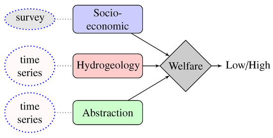The groundwater levels data, representing the state of groundwater resource, consists of water level estimates obtained from a groundwater flow model developed as part of the wider research program which this study is part of [18]. Similarly, the abstraction data, representing the demand, consists of measured weekly community handpump abstraction data [19]. We attempt to model the welfare status of people based on a combination of three factors—environmental state of resource, demand, and socio-economic status of people. These factors are represented by water level, abstraction, and socio-economic survey data respectively in a multi-input multi-output neural network.