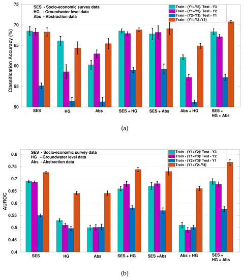 It can be observed that there is complementary information in different modalities as evident from the results for all the data (brown bars). These results are consistent when year one and year two data is used for training and year three is used for testing, except a slight peak in the results for socio-economic survey and groundwater levels data as input.