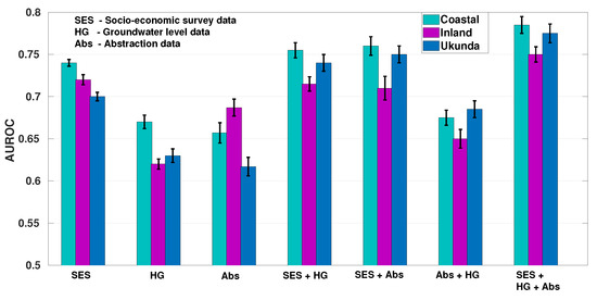 In an attempt to assess the differential value of the proposed model with respect to geographical location of the study area, we disaggregate the model outputs by specific zones. Although there are no physical boundaries separating these zones, the study area consists of three distinct zones based on geographical characteristics livelihood activities—Ukunda (urban, tourism, some access to piped water), coastal (rural, fishing, water drawn from shallow wells in a karstic coral aquifer), and inland (rural, mining, and commercial irrigation, water from boreholes a sandstone aquifer). The total number of households sampled in coastal, inland and Ukunda regions are 2355, 1361 and 488, respectively. The AUROC (with 95% CI) plots for a three-fold stratified cross-validation, with different modalities of data as input, for different regions are shown in Figure 5.