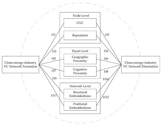 For the dissolution of network relationships, the network relationship formed by high-reputation VC firms tends to remain stable in view of maintaining a good reputation. First, to maintain their reputation, high-reputation VC firms will set stricter screening criteria when selecting syndication partners, requiring potential partners to have higher investment capacity and more expertise regarding clean energy industries, preferring peers with the same high reputation to form syndication relationships [11]. The resulting network relationship has a higher value and tends to remain stable. Second, to ensure the performance sustainability, high-reputation VC firms usually adhere to their own choices, strive to maintain the cooperative relationships established in the clean energy industry, and improve the stability of those network relations. Therefore, we propose the following hypotheses: