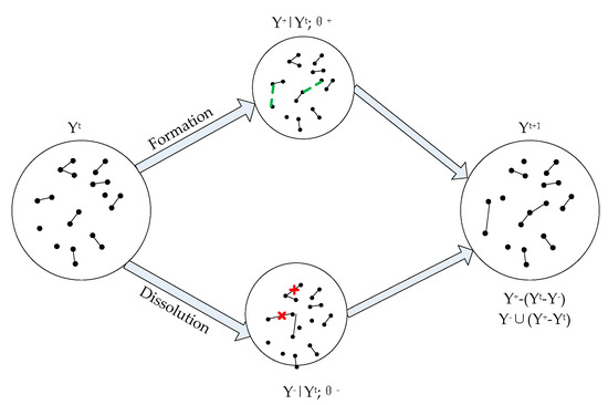 STERGM is a recently developed extension of the exponential-family random graph model (ERGM), which is the current mainstream relationship-oriented social network evolution analysis model [13]. A STERGM shows that a network at time t is conditional on the network at time t − 1, and it independently analyzes the formation and dissolution of links. A schematic diagram of STERGM is shown in Figure 2.
