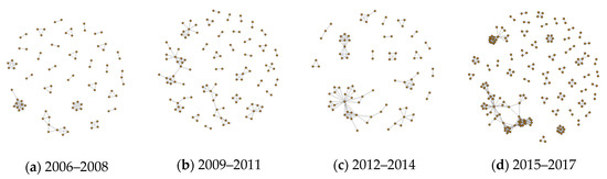 At present, the construction of a VC network is mostly based on syndication investment [4]. Therefore, we constructed the Chinese clean energy industry VC network based on the clean energy startups’ syndication investment, with the VC firms as the nodes and the syndications as the links. This implies that if two VC firms have a link, they will have invested in one or more common clean energy startups. To account for the potentially time-varying effects of our explanatory variables and the dynamics of VC networks, we use three-year windows to construct the VC network, namely, 2006–2008, 2009–2011, 2012–2014, and 2015–2017.