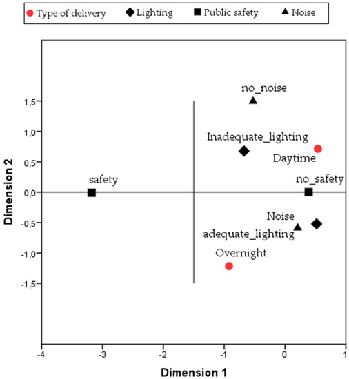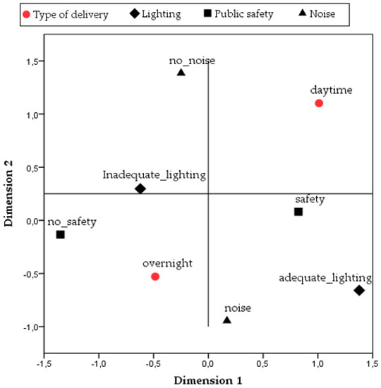 The multiple correspondence analysis was applied to highlight the main problems arising from carrying out the type of deliveries, according to drivers (Figure 1) and receivers (Figure 2). Thus, it was observed which categories are closer to the daytime delivery option, and which are closer to night deliveries for both investigated subjects. The variables in the analysis related to night delivery problems are noise, public safety, and lighting. Before applying MCA, the chi-square test was used to verify if there was an association between the categories of the variables. The null hypothesis of the test was rejected, indicating that there is an association between the categories of the variables (i.e., type of delivery, lighting, noise, and public safety).