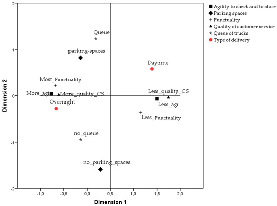 It was verified which variables contribute the most in improving the efficiency of urban deliveries per period. The following variables were used: punctuality, agility to check and to store, quality of customer service, parking spaces, and truck queue length. The chi-square test was also applied before MCA to verify if there was an association between the categories of these variables. The null hypothesis of the test was rejected, indicating that there is an association between the categories of the variables. Table 6 presents the coordinates (scores) of the categories of each variable for two dimensions. Based on these scores, we then generated the perceptual map (Figure 3) which shows an association between the preferences for daytime deliveries with three logistics efficiency variables: agility to check and to store goods, quality of customer service, and punctuality.
