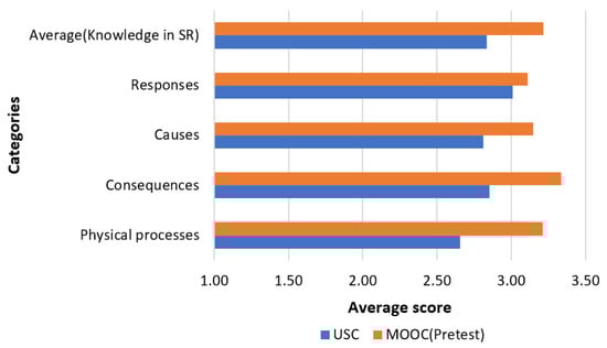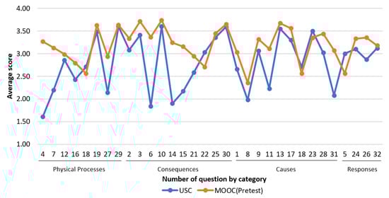 Comparison of scores between the original sample of the “Resclima study” [] (blue line labelled USC) and the pretest of the MOOC sample (orange line). Both samples contain all the available populations. The questions are grouped according to the four basic areas used to design the MOOC: physical processes, causes, consequences and responses. On the horizontal axis, we present the number of the statement in the questionnaire grouped according to the four areas that we have designed in our study. On the vertical axis, the average score in a given question.