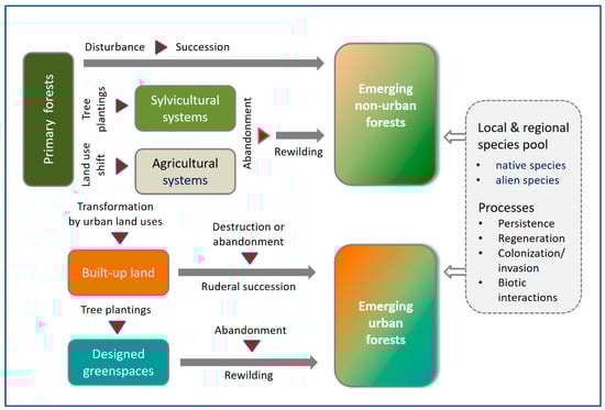 - Facilitate and elucidate the adaptation of ecological systems to urbanization and other environmental pressures. Urbanization as a major driver of change in the Anthropocene period affects all components of urban ecosystems [184]. In consequence, novel urban ecosystems arise and support the understanding of how species assembly responds to a combination of novel environmental drivers in urban settings [141,185]. Allowing emerging forests to develop without intervening in the diversity patterns of alien and native species will provide insights into the adaptation of forest systems to changing urban environments, including interactions with climate change effects; and will allow conclusions to be drawn on the resilience of species and communities to urban pressures, and selection of suitable native or alien species for urban greenspaces.