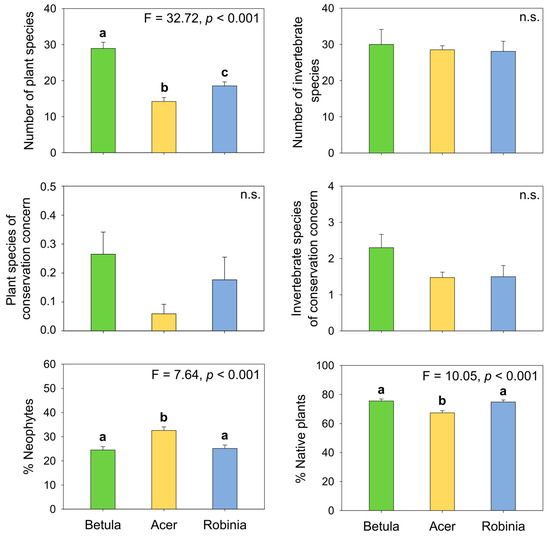 - Hejda, M.; Hanzelka, J.; Kadlec, T.; Štrobl, M.; Pyšek, P.; Reif, J. Impacts of an invasive tree across trophic levels: Species richness, community composition and resident species’ traits. Divers. Distrib. 2017, 23, 997–1007. [Google Scholar] [CrossRef]